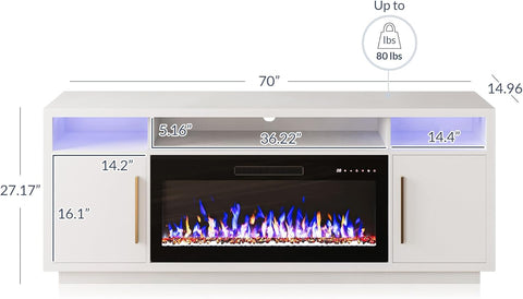 This white fireplace TV stand has an elegant design with a sleek look that fits into any living room. It has three open shelves and two spacious cabinets for storage, with each shelf holding up to 30 lbs. It can support TVs up to 80 lbs and is suitable for TVs up to 80 inches.