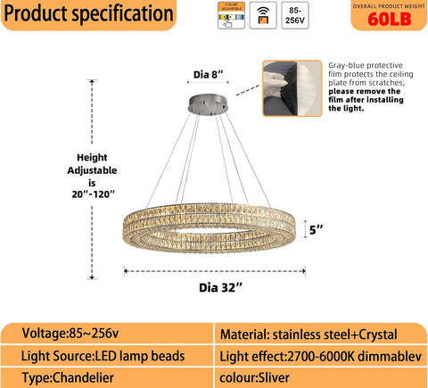 Dimmable LED Crystal Ring Chandelier Include Built-in 103 Watts High-quality LED ceiling lightstrip, Uo to 9270lumins provides ample liaht.With 3-color temperature changing. Please notethat chandeliers have own dimmers (include),only can be used with reqular wall switches, and isnot compatible with home dimmer switches, You also can use remote(included) andAPP(Lampsmart pro) to switch color temperature as you like from 2700k-6000k and 5%-100%brightness adjustment.DC.Voltage=85-256V.
