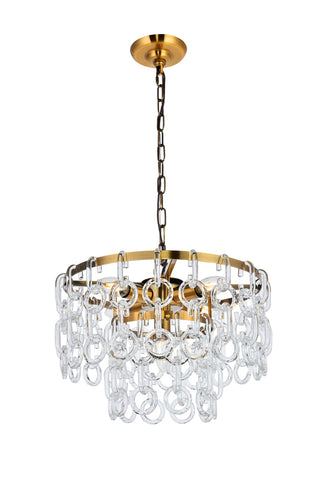 Clear crystal ringlets suspended from circular tiers of the light antique brass frame.