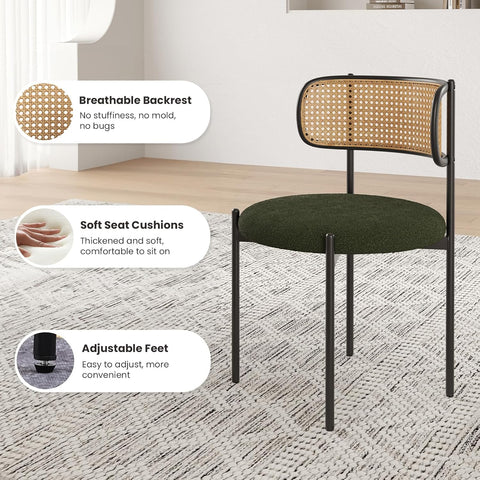 Modern Dining Chairs Set of 2, Upholstered Chairs with Rattan Back and Metal Legs, Green