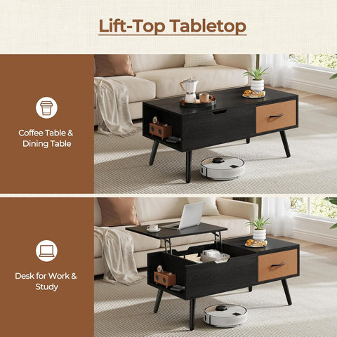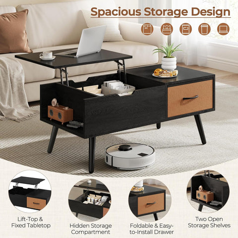 Lift Top Coffee Table, Wooden Small Center Tables with Large Storage Shelf Drawer and Hidden Compartment Modern, Black