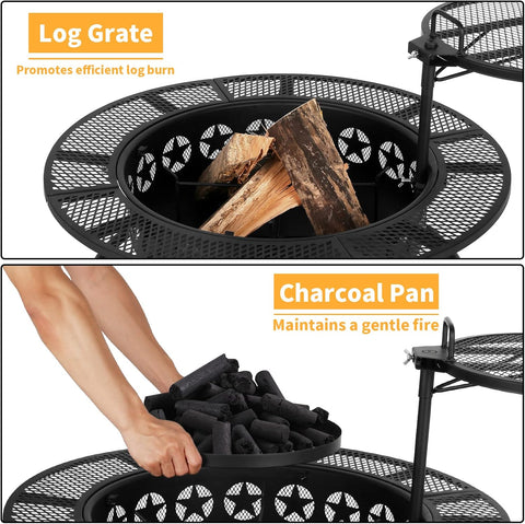 - 【Accessories Complete】: The fire pit also features a log rack, a charcoal pan, and a poker. The log rack can help promote efficient log burn while the charcoal pan can be placed into the fire pit for holding charcoal, maintaining a gentle and even fire when grilling.