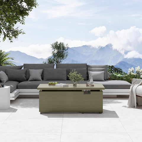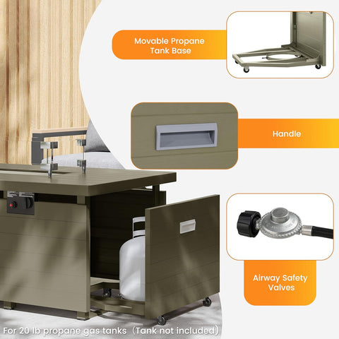 • User-Friendly Propane System & Smart Features: The convenient sliding base accommodates standard 20-lb propane tank (not included,) for easy fuel changes. Thoughtful design elements include accessible controls, proper ventilation, and generous table space (51" L) for drinks and decor when used as a coffee table. Recommend propane tanks under 17.3".