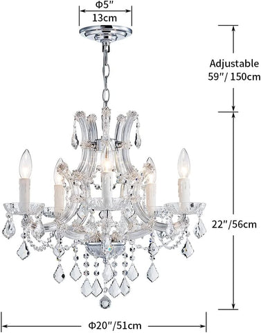 The fixture dimensions for this crystal chandelier are 22 inches in height, 20 inches in width, and 20 inches in depth. The adjustable chain extends to a maximum height of 60 inches for proper installation.