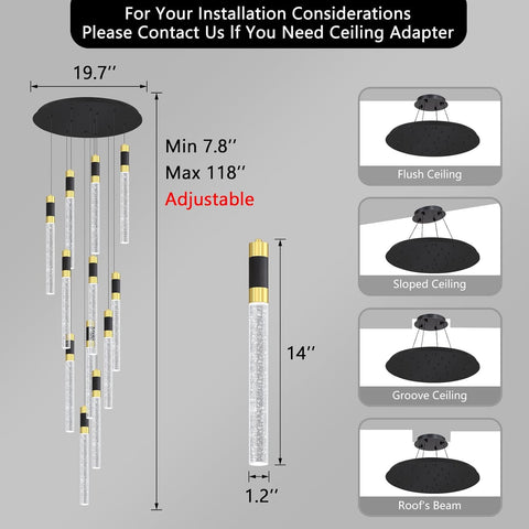 High Ceiling Crystal Chandelier - Canopy width 19.7 inch, adjustable height min 7.8 inch to max 118 inch. Any voltage in the range of AC110-240V can install directly
