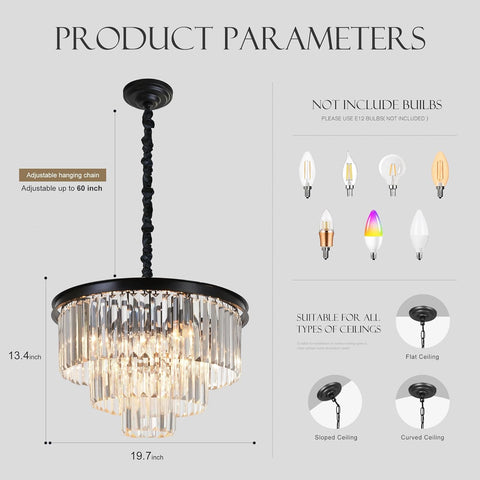 This round crystal chandelier is W 19.7" and H13" with adjustable chain, it can be adjusted to maximum 49". It can be easily adapted to different space in your home, perfectly fits on high ceiling or lower ceiling.