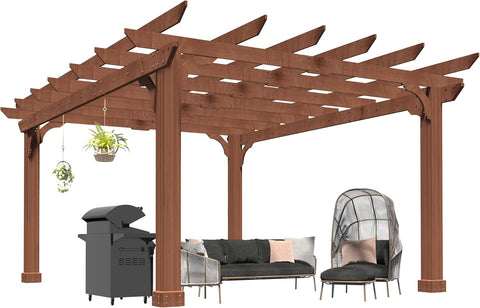 10x12 FT Wooden Pergola, Cedar Wood Gazebo with Flat Roof, Outdoor Garden Shelter with Stakes Included, Patio, Deck, Backyard, Lawn