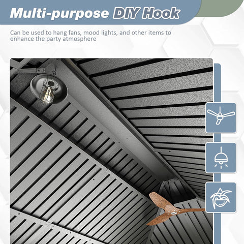 - - With dimensions of 10x12x9.2 feet, the pavilion offers ample space to comfortably accommodate 6–10 people for gatherings, parties, or leisure activities. Ideal for patios, lawns, backyards, and gardens, it serves as a stylish and functional centerpiece for your outdoor living area