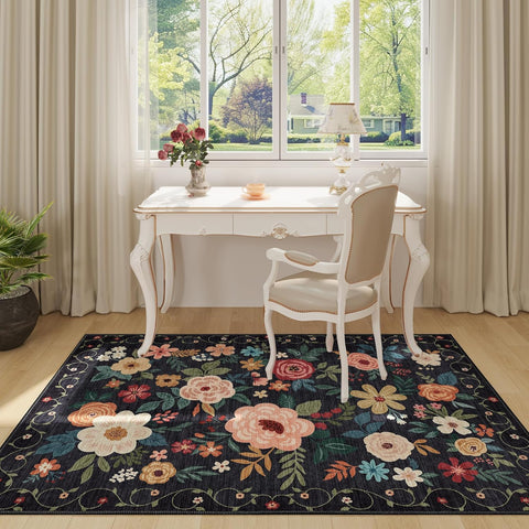 3x5 Washable Floral Area Rug, Lightweight Non-Slip Carpet for Living Room Bedroom Black