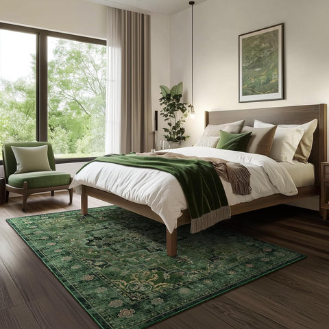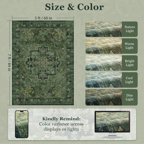 5x7 Washable Vintage Medallion Area Rug, Low Pile Non-Slip Carpet Dark Green