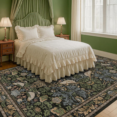 8x10 Washable Floral Area Rug, Low Pile Non-Slip Nature Design Carpet Dark Green Brown