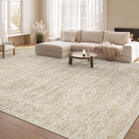 8x10 Washable Geometric Area Rug, Low Pile Non-Slip Moroccan Carpet for Living Room Bedroom Beige