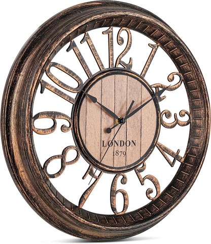Bernhard Products Large Wall Clock 16 Inch Non Ticking Battery Operated Brown Rustic Farmhouse Vintage Design Stylish