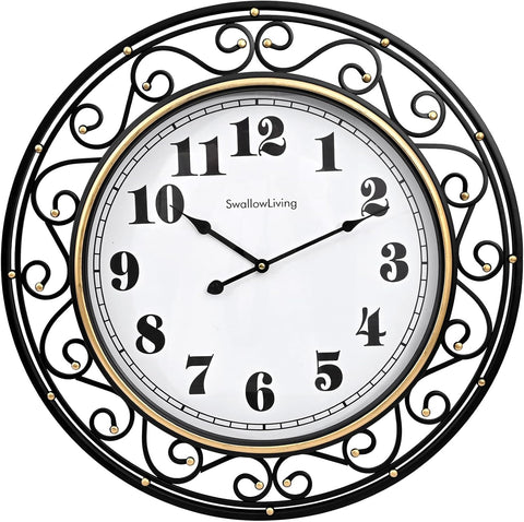 SwallowLiving 24 Inch Vintage Iron Metal Frame Wall Clock Silent, Battery Operated, Elegant Retro Decor