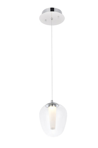 Clear glass shade with chrome finish top encases white textured center point with light inside.