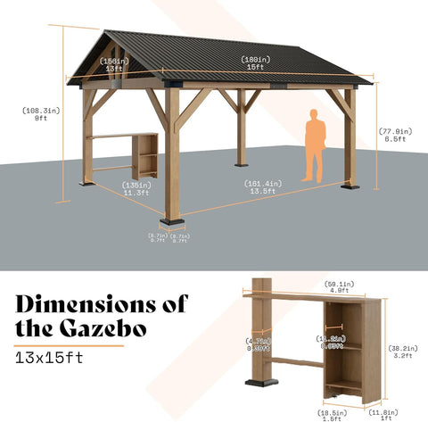 13x15 FT Wood Gazebo, Hardtop Pergola with Steel Gable Roof, Outdoor Gazebo with Guest House, Porch, Patio