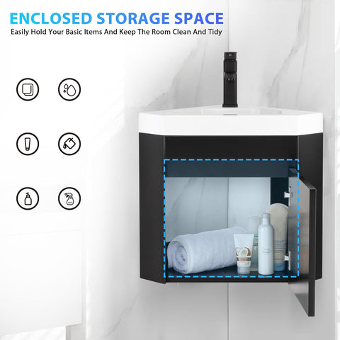 22" Corner Bathroom Vanity with Sink – Wall-Mounted Floating Cabinet for Small Spaces, White Resin Sink with Matte Black Faucet, Black