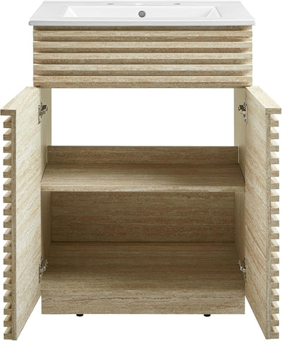 24-Inch Bathroom Vanity with Sink Combo – Faux Travertine Slatted Design, Mid-Century Modern Cabinet with Soft-Close Doors, White