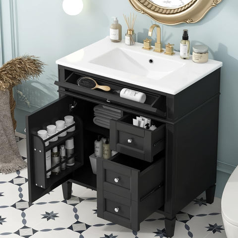 • Easy Installation – Includes labeled parts and detailed instructions for a smooth assembly process. Overall dimensions: 30"W × 18"D × 33"H. This vanity delivers generous storage and everyday practicality while enhancing the look of your bathroom.