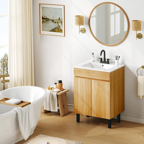 24-Inch Modern Bathroom Vanity with Undermount Ceramic Sink – Natural Brown Cabinet with Adjustable Legs, Soft-Close Double Doors & Drain