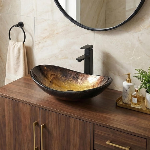 Elevate your space with this 28 inch natural color bathroom vanity, rustic fixture standing pedestal cabinet with gold boat vessel sink. Designed with both style and functionality in mind, this piece makes a perfect addition to any home.