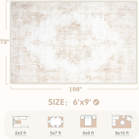 6x9 Washable Vintage Medallion Area Rug, Low Pile Non-Slip Carpet for Living Room Bedroom Beige