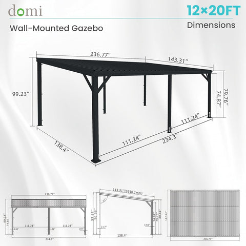 12' x 20' Lean to Gazebo, Wall Mounted Gazebos Pergola with Built in Drainage System, Galvanized Steel Roof