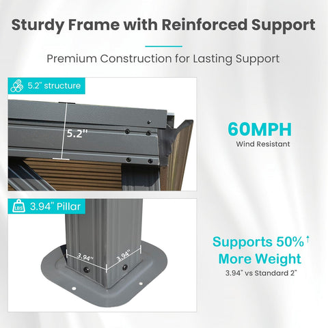 - Reinforced Heavy-Duty Frame for Maximum Support: Engineered for long-term use with upgraded frame strength, supporting 50% more weight than standard gazebos, perfect for year-round outdoor use