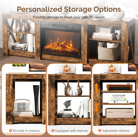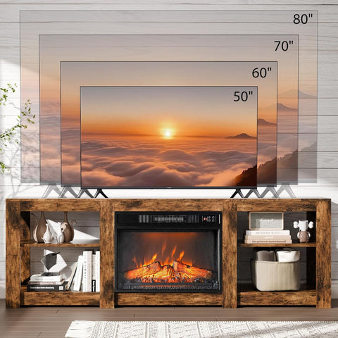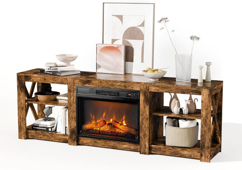 Fireplace TV Stand for up to 80 inch TVs, Farmhouse Entertainment Center with Electric Fireplace Heater & Adjustable Shelves, Fireplace Media Console Table for Living Room, Rustic Brown