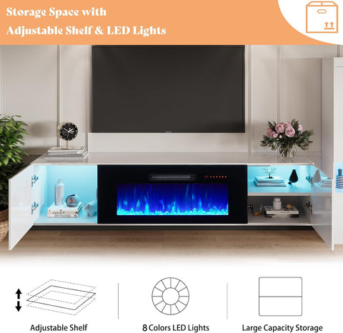 Floating Wall-Mounted Fireplace TV Stand with 40 Inch Electric Fireplace, Mirrored Entertainment Center, Modern LED Lighting for TVs up to 90 Inches, White