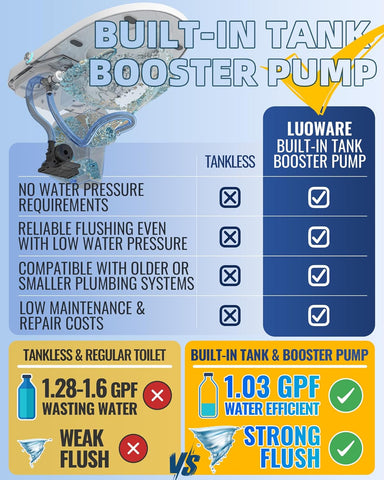 • Built-In Tank & Booster Pump: Delivers peak flush performance with just 1.03 gallons per flush, saving water and working efficiently even in low water pressure homes. Super whirlpool siphon jet ensures powerful yet quiet flushing.
